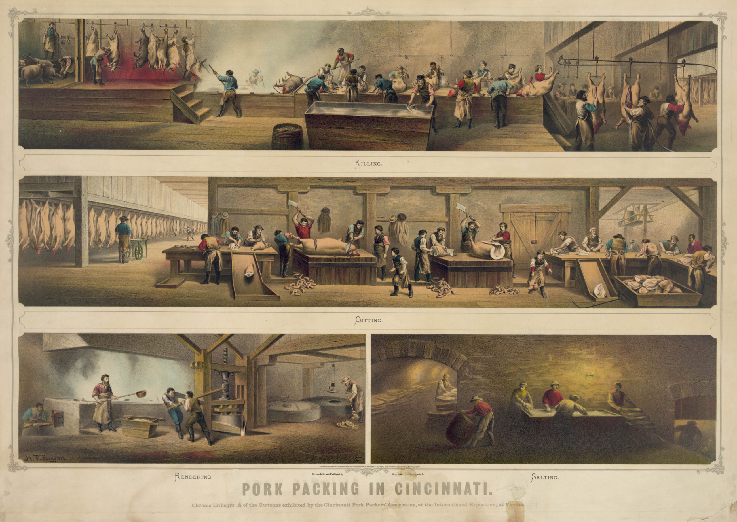 Henry Farny illustrated this amazing overview of the Pork Packing industry that was big business in Cincinnati, Ohio, at the time, earning the city the nickname “Porkopolis”.