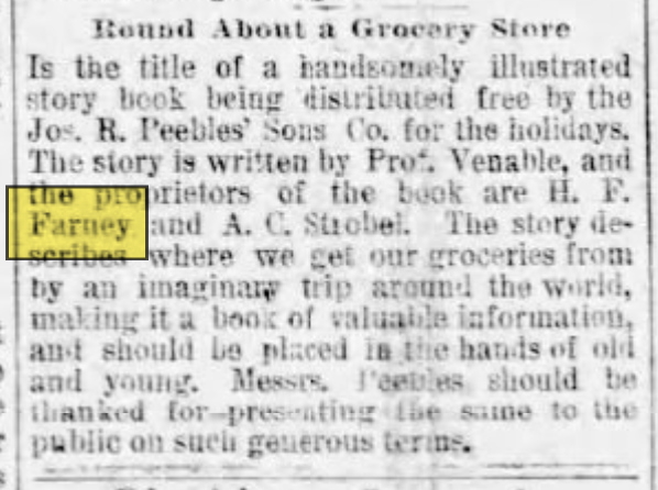 A.C. Strobel, who was married to Farny’s youngest sister, Marguerite, and worked at the Rudolph Wurlitzer company, was also involved in producing this book. (Dec. 17, 1888, The Cincinnati Post, page 1, column 4). Farny’s older sister, Leonie, was married to Rudolph Wurlitzer.
