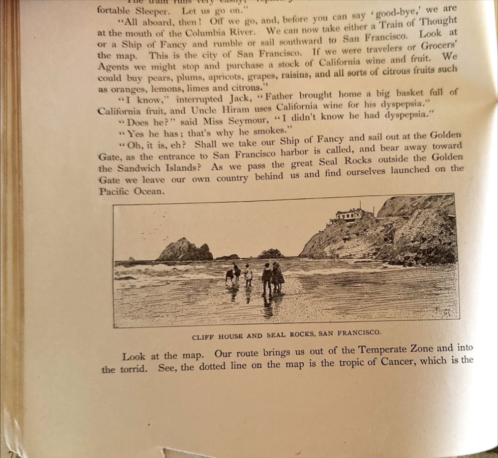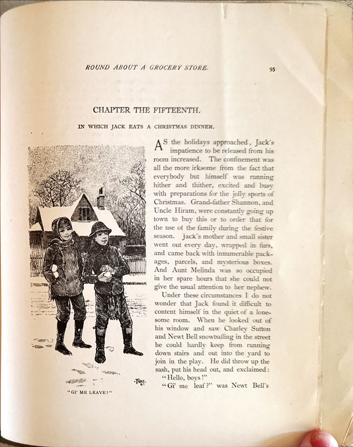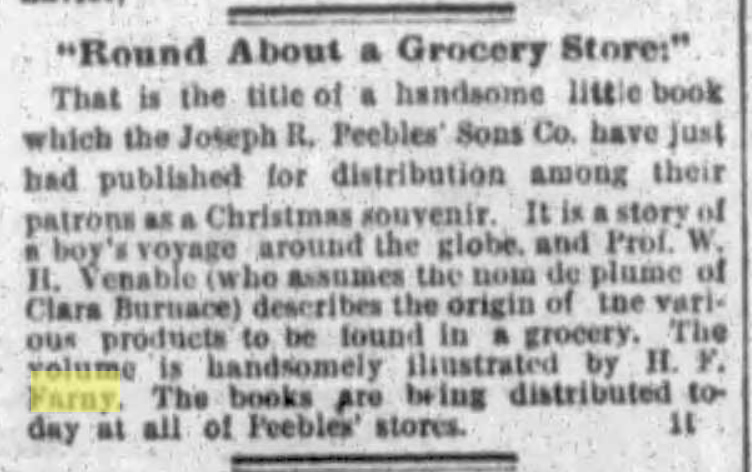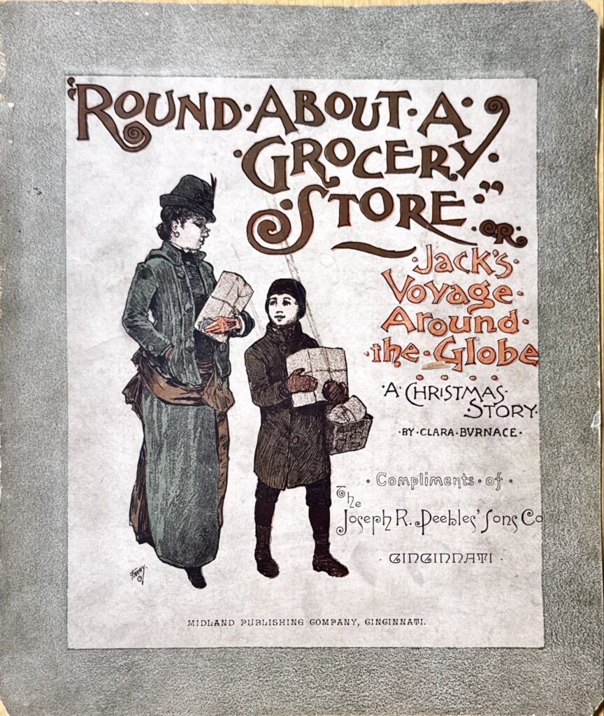 Henry Farny illustrated some of the images in this 98-page Christmas booklet, Round About a Grocery Store, Jacks Voyage Around the Globe, given away by Jos. R. Peebleās Sons Co., a business incorporated in mid-1888 and located, like Farny at the time, in Pike’s Opera building in downtown Cincinnati. While filled with stories, the booklet also includes six pages of ads in the back.