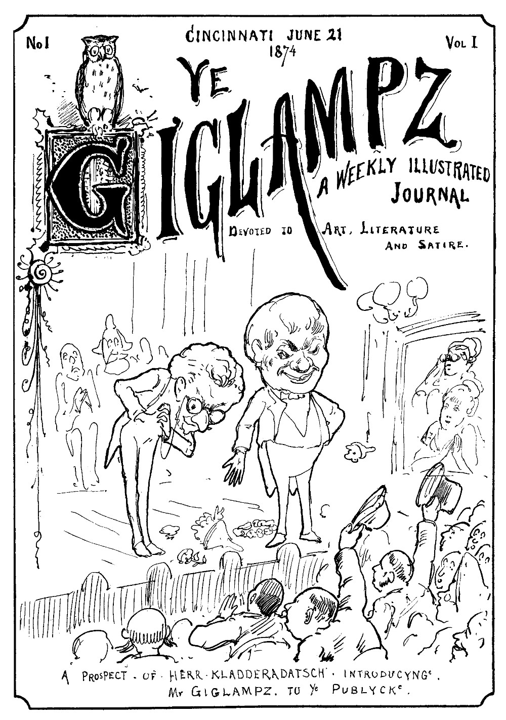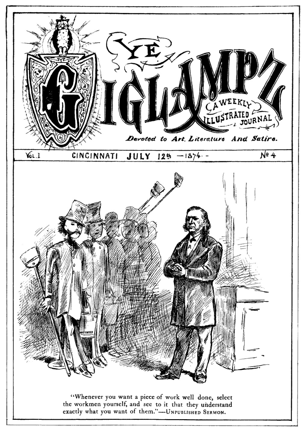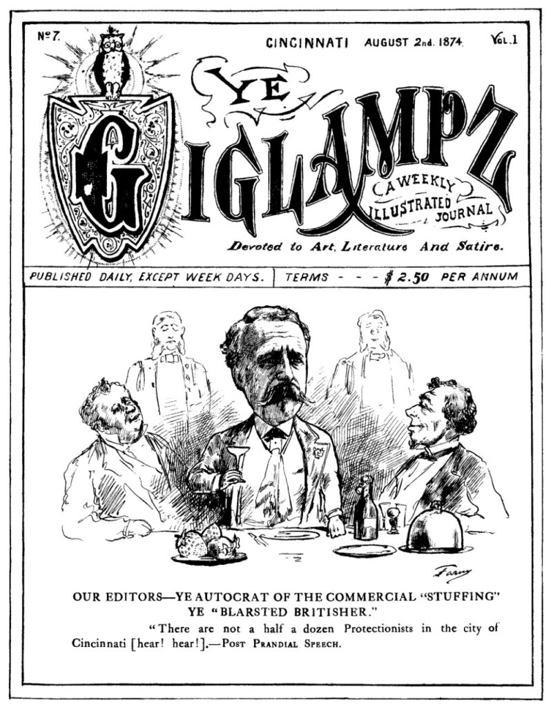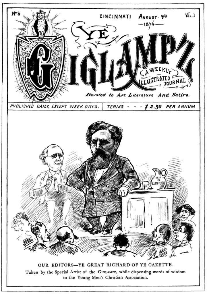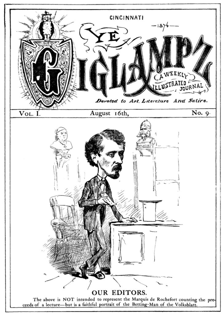 On June 21, 1874, Farny teamed with reporter/writer Lafcadio Hearn to produce a new magazine. Ye Giglampz, a weekly devoted to “art, literature and satire,” The name was a play in German on the large eye-spectacle that Hearn wore.