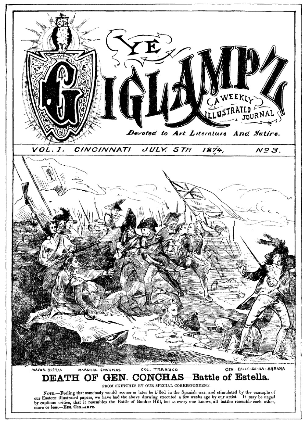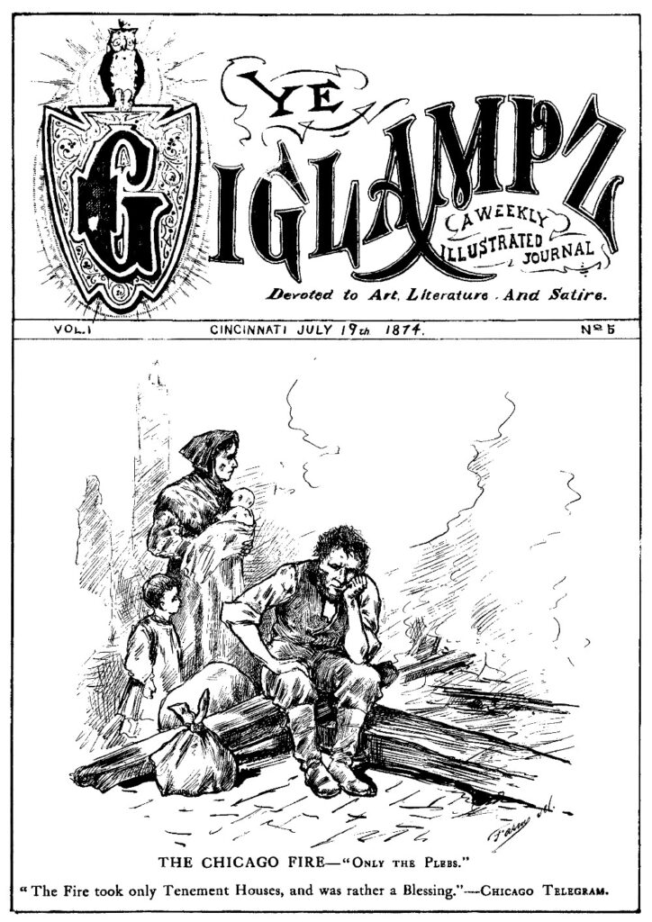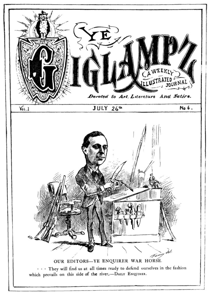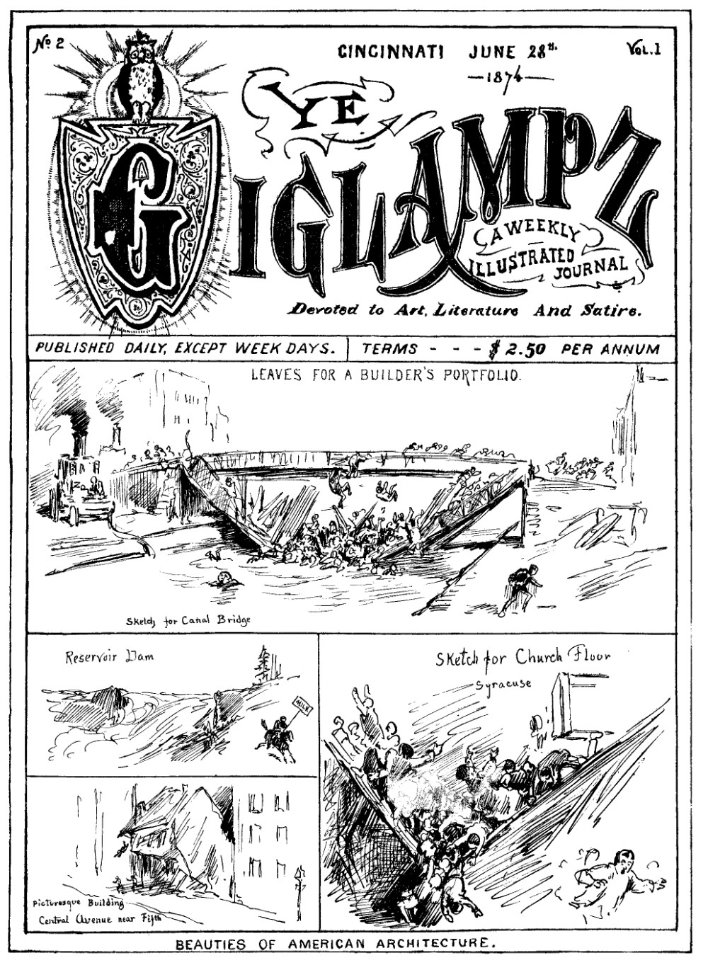 On June 21, 1874, Farny teamed with reporter/writer Lafcadio Hearn to produce a new magazine. Ye Giglampz, a weekly devoted to “art, literature and satire,” The name was a play in German on the large eye-spectacle that Hearn wore.