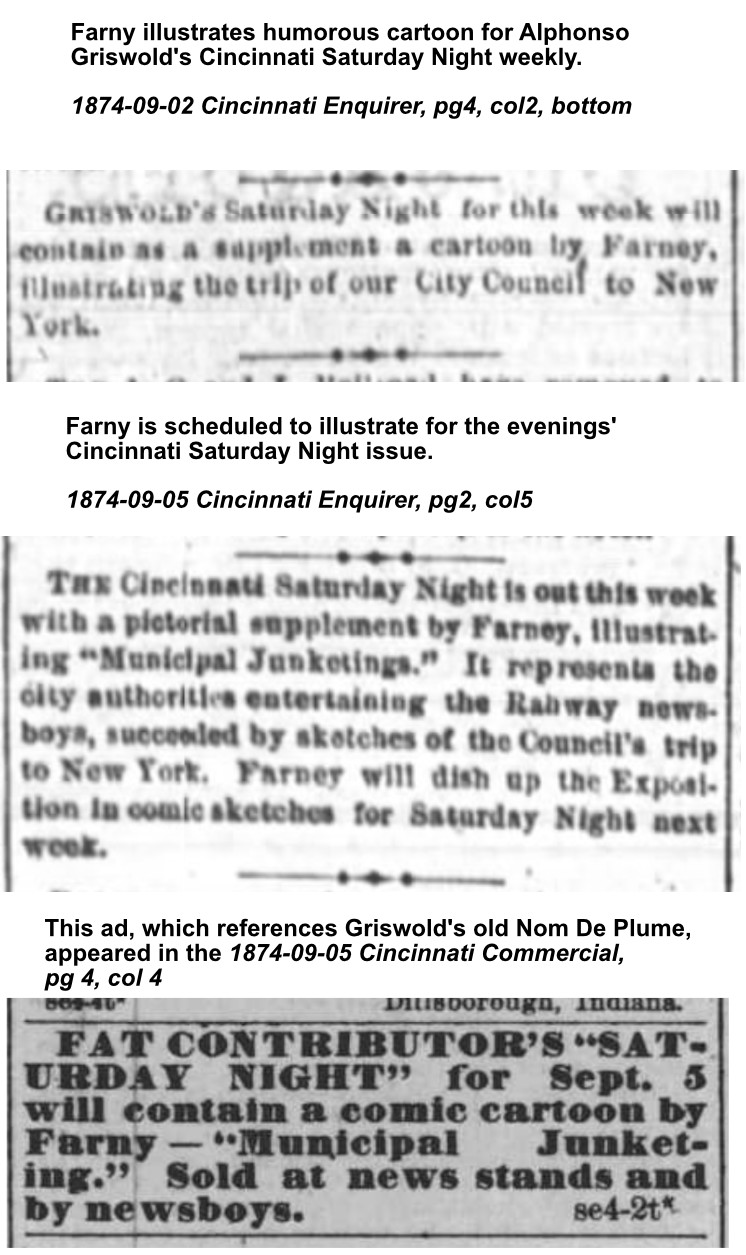 Following the demise of Ye-Giglampz, one of Farny’s next efforts was to illustrate a cartoon for Alphonso Miner Griswold’s Cincinnati Saturday Night.