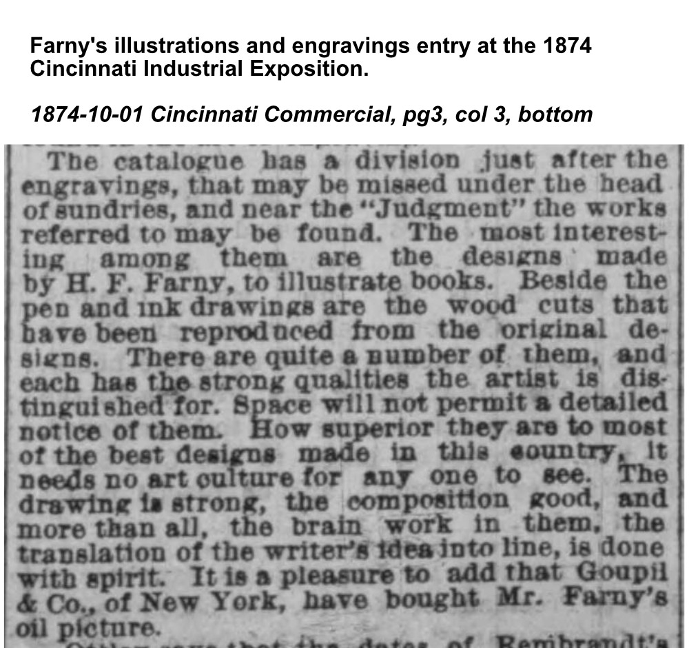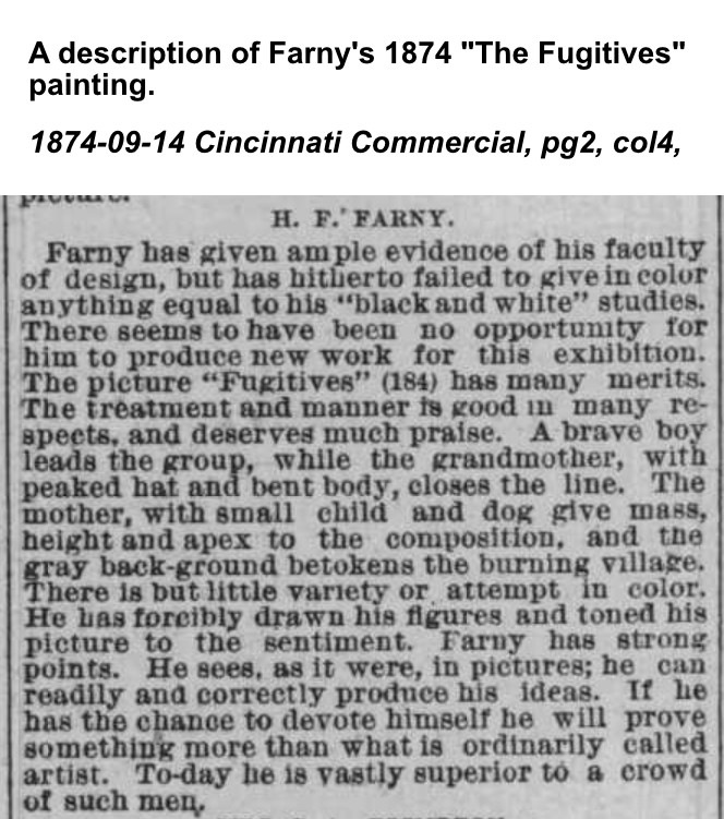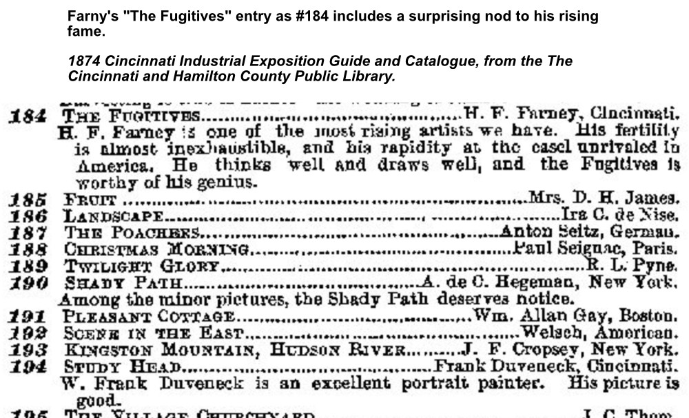 THE FUGITIVES: Also entered into the Exposition was Farny’s “The Fugitives” oil painting. Curiously, the official Expo guide and catalogue included a flattering description of “Farney” (pg VIII). Frank Duveneck is also mentioned, but with less enthusiastic praise. When and where Farny and Duveneck met isn’t clear yet, but they would go on to be life-long friends.