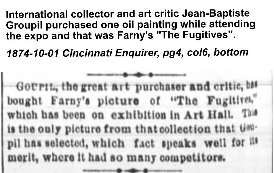 International art collector and critic Parisian Jean-Baptiste Adelphe Groupil, co-founder of what became Couple & Cie, bought just one painting while attending the Cincinnati expo, and that oil painting was Farny’s “The Fugitives”.
