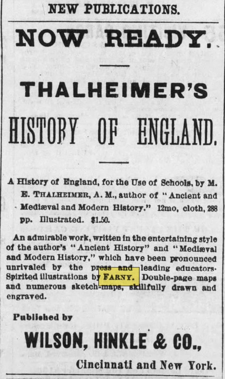 A month after Henry Farny departed for Europe in August of 1875, along with Frank Duveneck, Frank Dengler, and John Twachtman, the publishing firm of Wilson, Hinkle, and Co, announced that M.E. Thalheimer’s new book on the History of England was ready for sale.