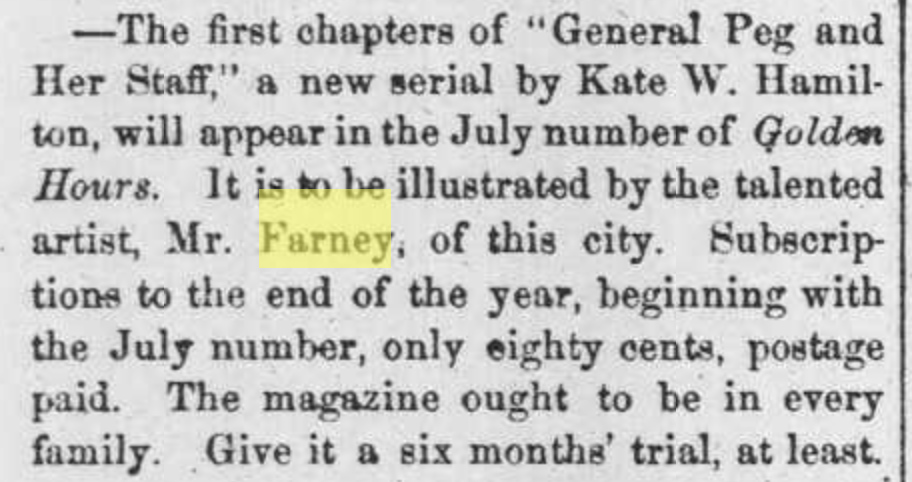 The first documented entry I can find about his return to the world of “Bread and Butter” projects are his illustrations for Kate W. Hamilton’s story General Peg and Her Staff. The April 18, 1877, issue of the Western Christian Advocate on page 125, column 1, noted Farny’s work for the story: