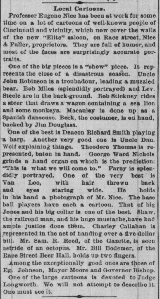 According to an August 03, 1879, article, in The Cincinnati Commercial, Professor Eugene Nice sketched a number of prominent Cincinnatians to be displayed as part of the new “Elite” Saloon on Race Street. This suggests that Farny’s visibility and recognition had risen over the 1870s.