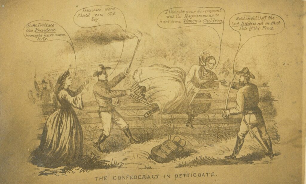 While there are other examples of artists who caricatured Jefferson Davis dressed in his wife’s petticoat, I can find only one other image that involves Davis climbing a fence and it appears to be a bad copy of the original above. Note how Davis’ left foot and leg are wedged oddly through the fence rails. Given all the Farny’s illustrations I’ve seen, this doesn’t look like his work to me. This image appears on Wikimedia: