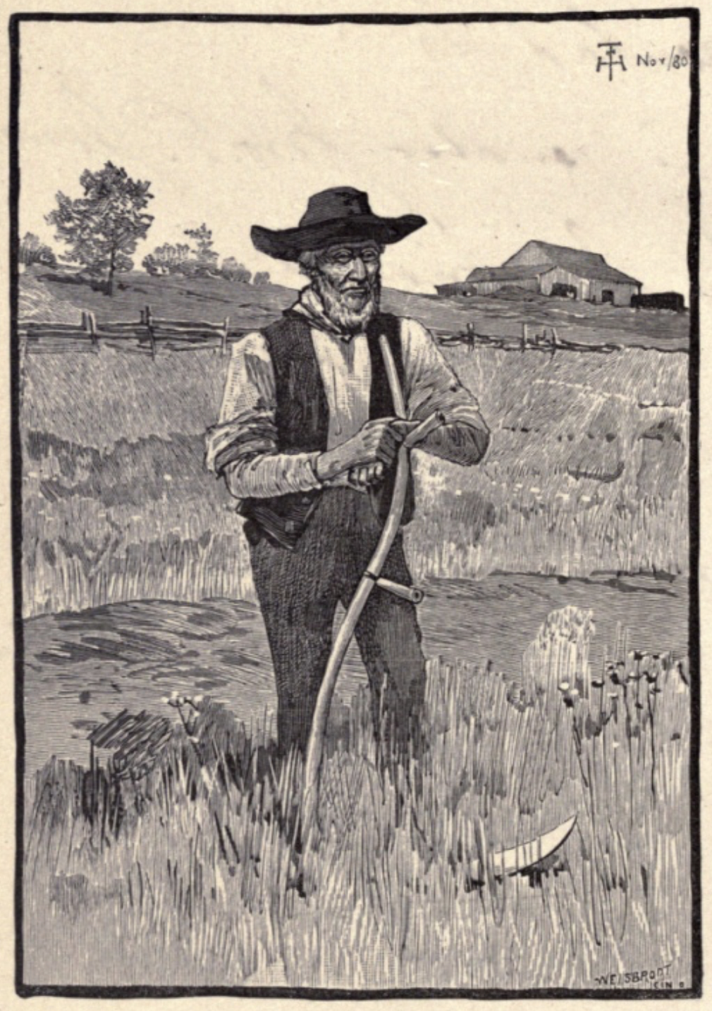 John James Piatt’s book “Idyls and Lyrics of the Ohio Valley” was released in December 1880. The book of poetry focused around Western Ohio included a detailed illustration of a farmer by Farny that precedes the title page.