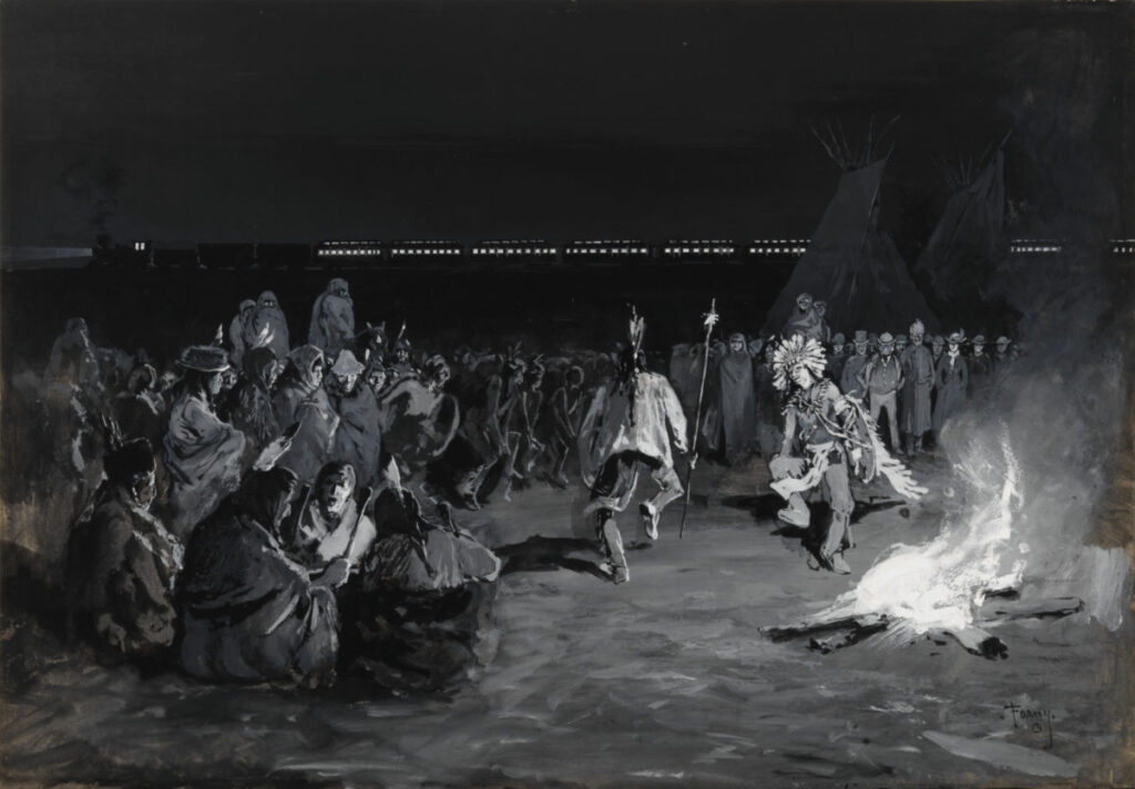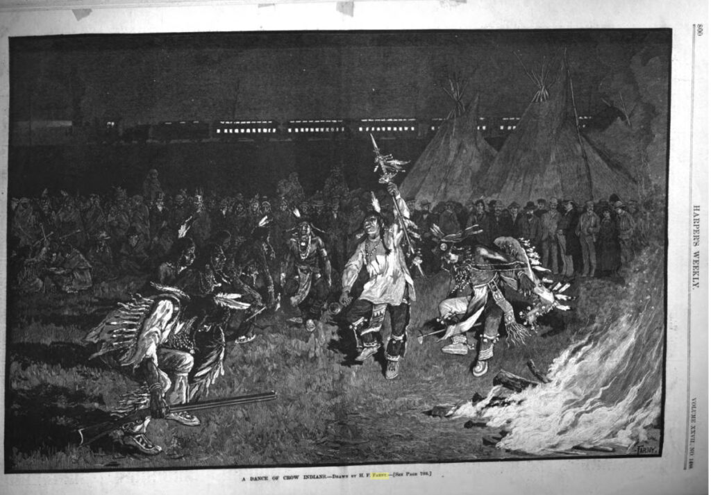 On December 15, 1883, Harpers Weekly published an illustration by Farny captioned with the name A Dance of Crow Indians. The image depicts an evening event related to the Last Spike of the Northern Pacific Railroad with a group of Crow Indians dancing around a fire, as Indians and non-Indians watch. In the distance, lights from a train’s passenger windows penetrate the dark, making a strong contrast to the dancing Indians. Below is the image that appears on Page 800 of that December issue: