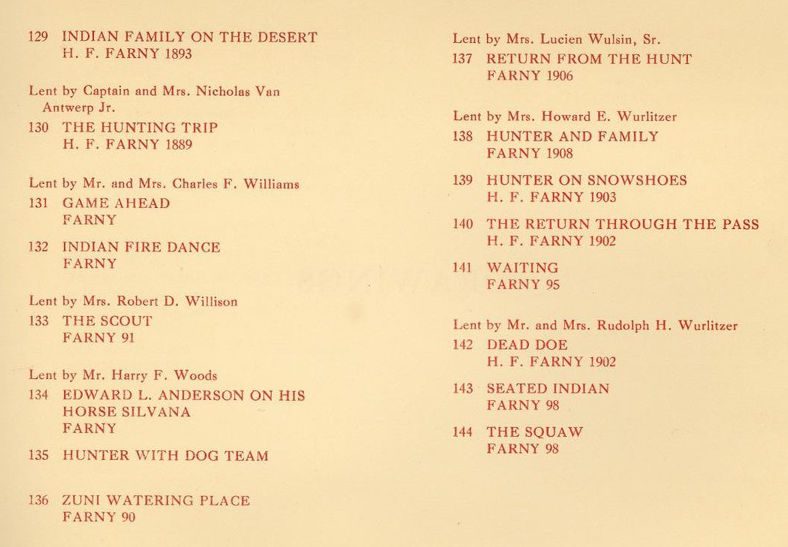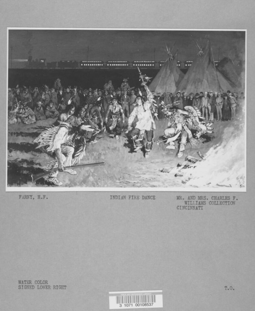 In 1943, The Cincinnati Art Museum held “HENRY F. FARNY AND THE AMERICAN INDIAN”, an exhibit of over 140 Farny works of art. Among the entries were two works lent by Mr. and Mrs. Charles F. Williams: Game Ahead (#131) and Indian Fire Dance (#132), as shown on the image from the catalog below. It is the latter name that concerns us: