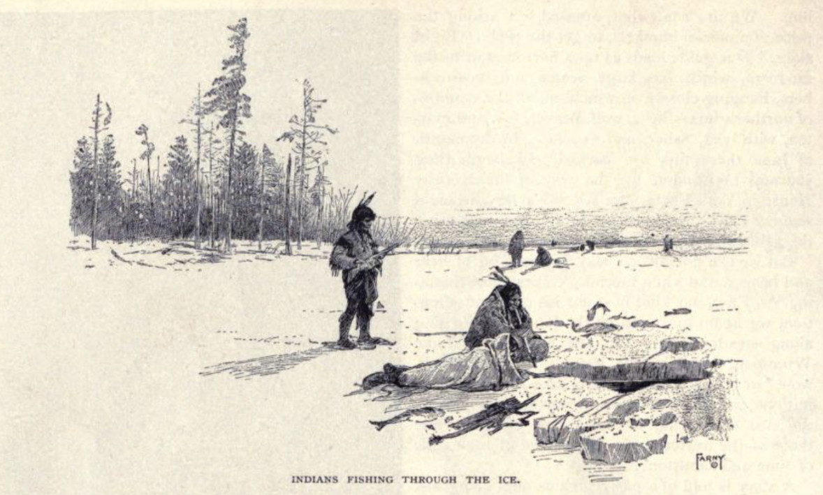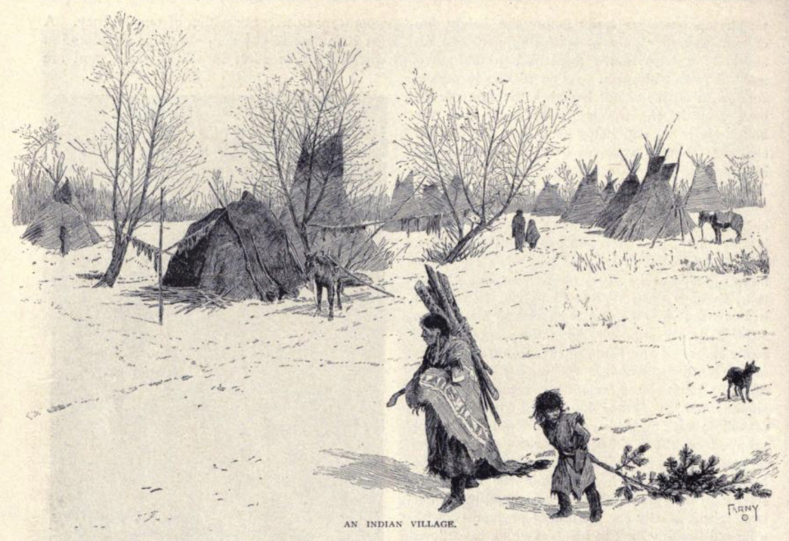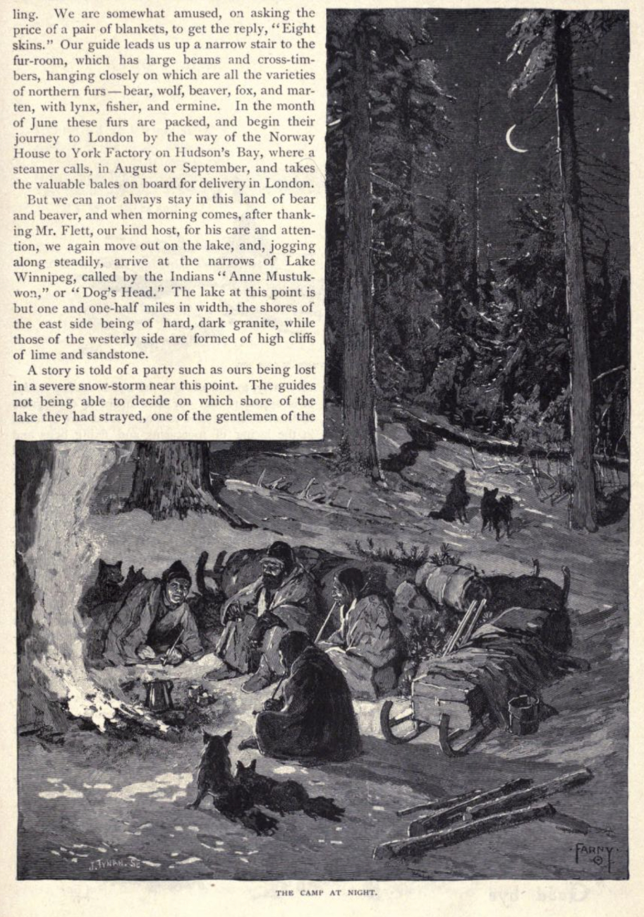 Note that two of the images appear thirteen years later in a 1895 book The Native Races of North America. The image labeled The Indian Legend of the Aurora below that appears on page 104 is relabeled War Dance in the Sky in the Native Races book. The image labeled The Camp at Night that appears on page 107 becomes Camping Out in the Snow in the North-west in the Native Races book.