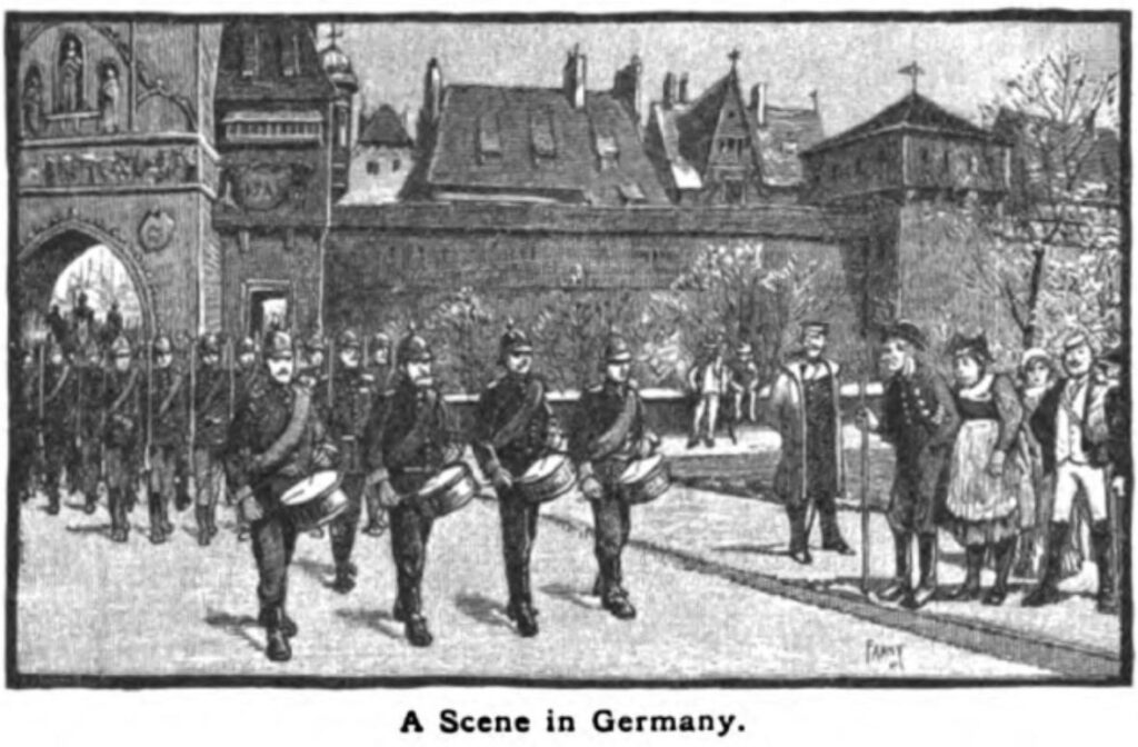 Page 68: A Scene in Germany, 1883-Preface-The-Eclectic-Elementary-Geography-Farny-Illustration-A-Scene-In-Germany-pg68.jpg, https://babel.hathitrust.org/cgi/pt?id=hvd.32044097023451&seq=74, https://onlinecollections.syr.edu/objects/33858/parading-the-troops