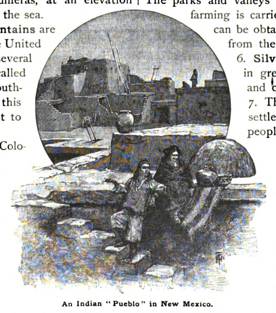 Page 47: An Indian “Pueblo” in New Mexico, 1883-Preface-The-Eclectic-Elementary-Geography-Farny-Illustration-An-Indian-Pueblo-in-NM-pg47.jpg, https://babel.hathitrust.org/cgi/pt?id=hvd.32044097023451&seq=53, https://onlinecollections.syr.edu/objects/29406/hopi-indian-village