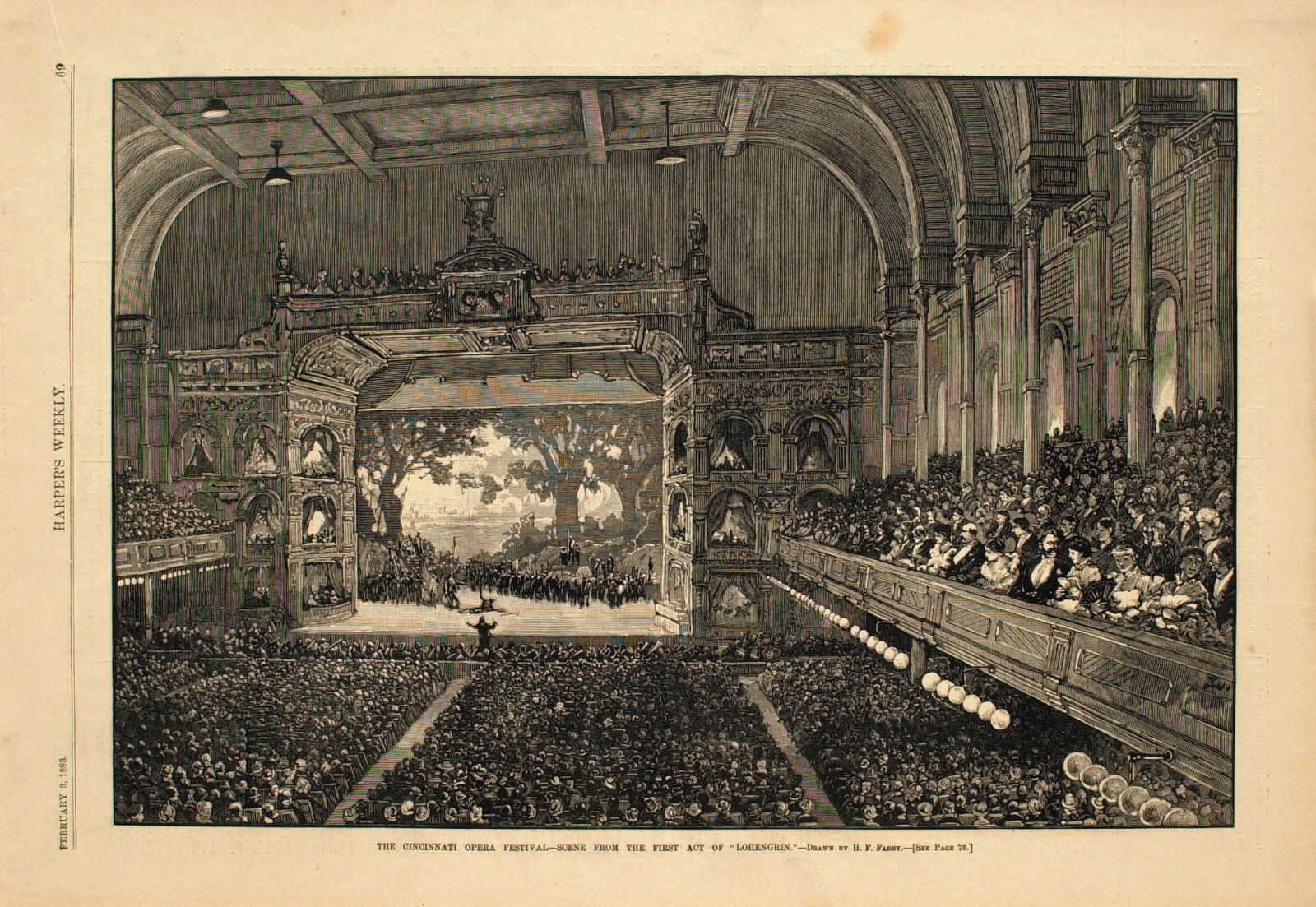 The February 03, 1883, issue of Harper’s Weekly includes a broad look at a scene inside Cincinnati Opera House. The play is Lohengrin. The image below can be found at Clarkart.edu.
