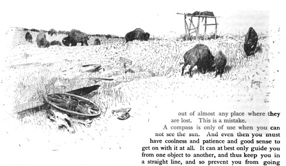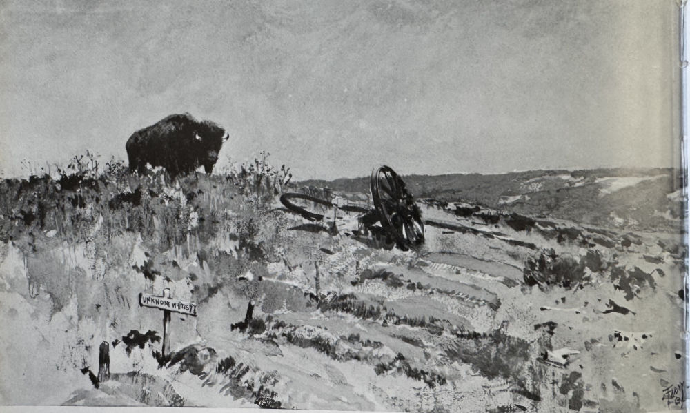 First, here’s the second of the two illustrations that appear in the story. It depicts the protagonists trying to find their way on the plains, but encountering troublesome prairie dog holes. Farny saw many of these holes during his trek across the plains in 1883 with the Villard Party on the Northern Pacific Last Spike adventure (several reporters on the trip mentioned the large swaths of prairie dogs on the prairie).