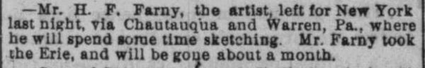 In September of 1885 the Cincinnati Commercial Gazette reported that Farny planned to spend a month traveling about Western New York and Warren, Pennsylvania. It seems likely he also visited his deceased love in Jamestown, which he reportedly did annually (and where he married Ann Ray in 1906).