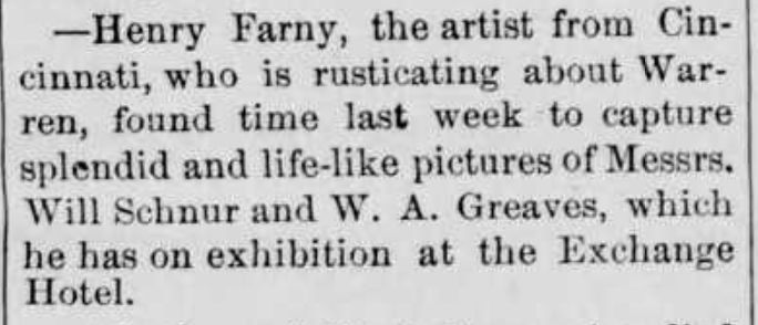 While in Warren, the Warren Mail noted that Farny had sketched locals Will Schnur and W.A. Geaves. The works were put on display at the local Exchange Hotel. Unfortunately, I’ve been unable to locate any sketches with those names.