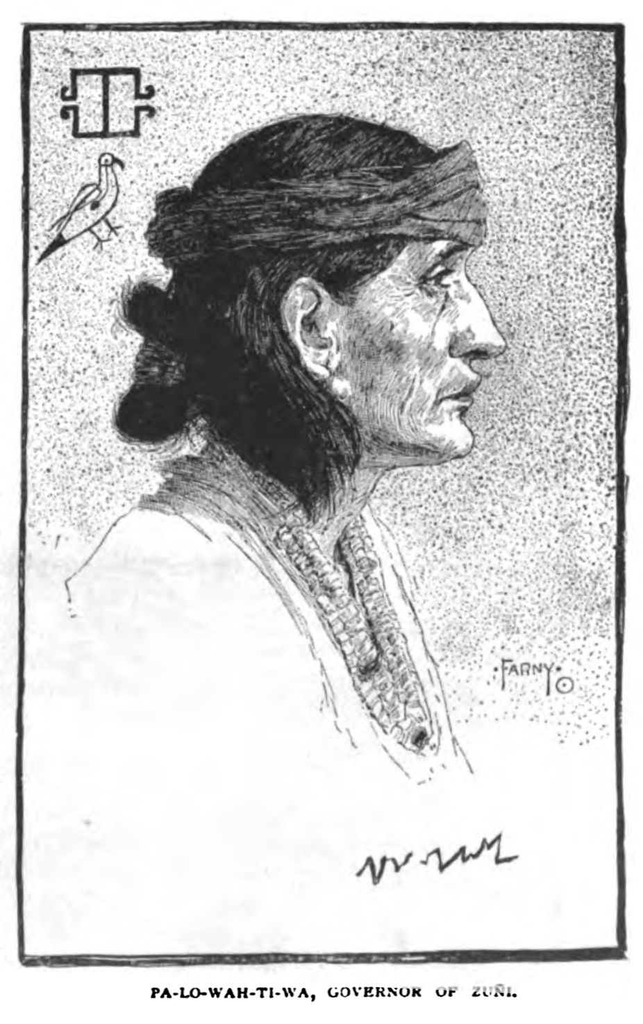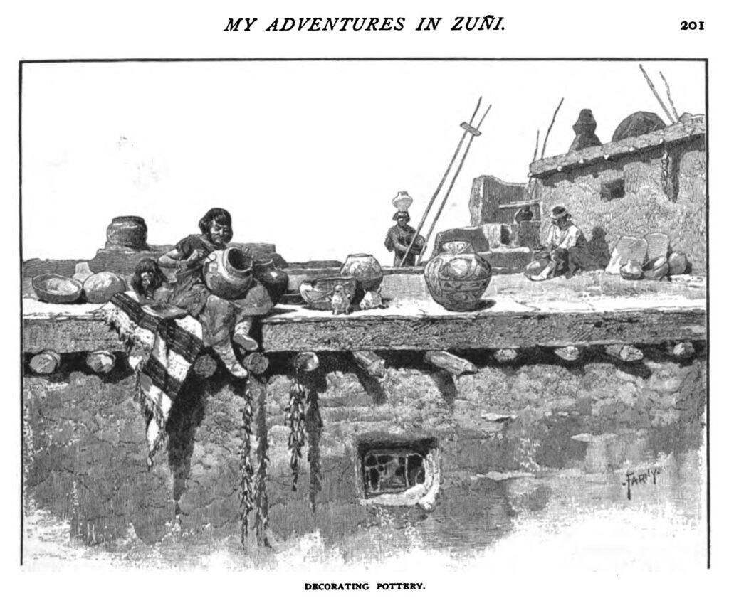 It is well-documented, on the other hand, that Farny did visit with the Zuni during a summer trip to Washington, D. C. Six members of the tribe had been touring for several months, guided by Frank Cushing, an anthropologist who would had been living with Zuni to better understand them and upon whom it fell to write the article, “My Adventures with the Zuni”, for Century Magazine that Farny would illustrate.