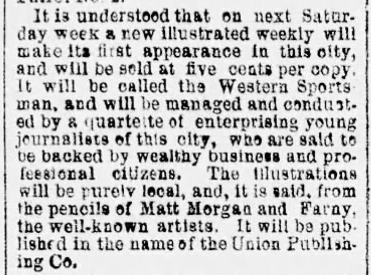 On August 07, 1884, the Cincinnati Post published a short note claiming Farny and Matt Morgan would be illustrating a new magazine, The Western Sportsman, published by Union Publishing. If they did illustrate for it, I can’t locate any evidence of the magazine in Cincinnati or their work for it.
