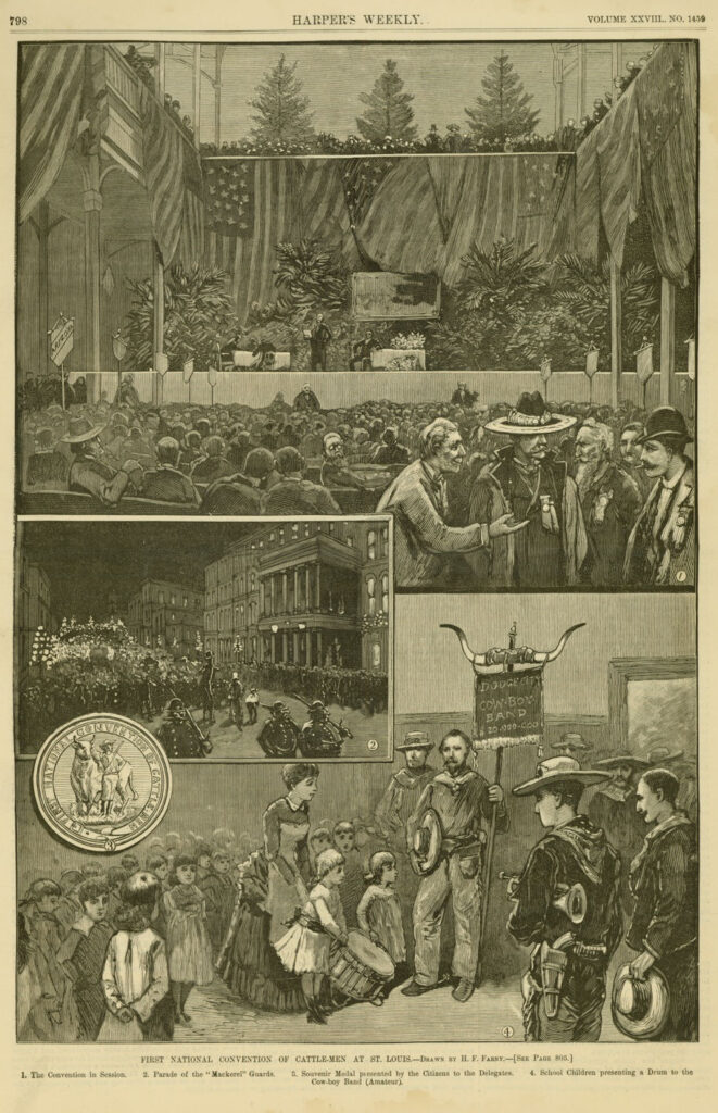 The December 06, 1884 issue of Harper’s Weekly included an illustration on page 798 by Farny showing The St. Louis Cattlemen’s Convention in St. Louis. It was the first national convention of cattlemen and was attended by representatives of local cattlemen associations from all over the United States.