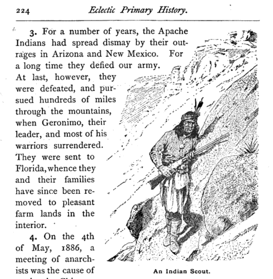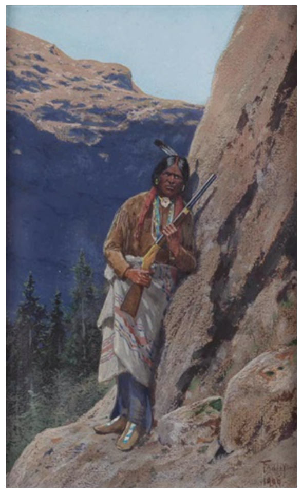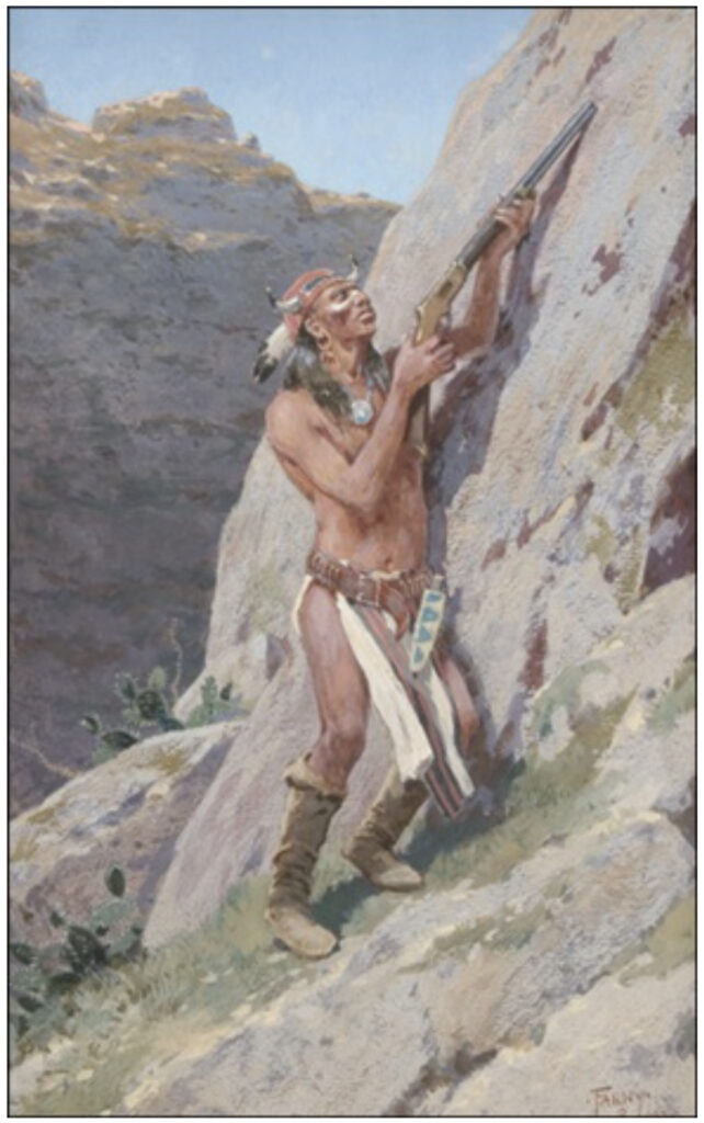 The 1884 book of Eclectic’s Primary History of the United State included a sketch showing an Indian against a steep rock, gun in hand. Farny would later repeat this theme in several paintings.
