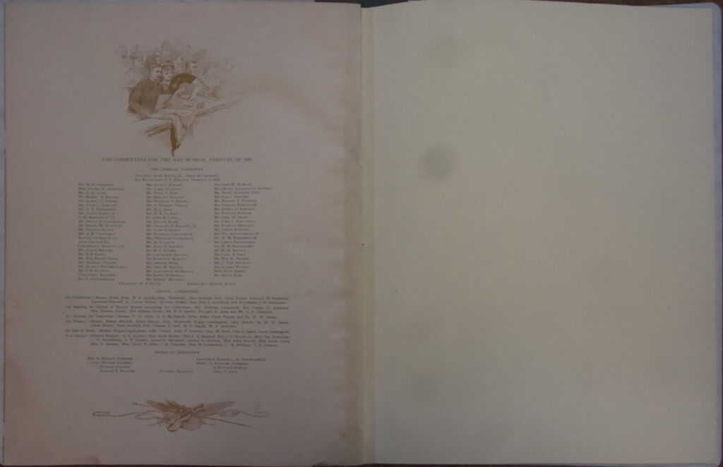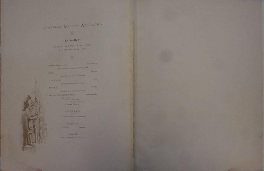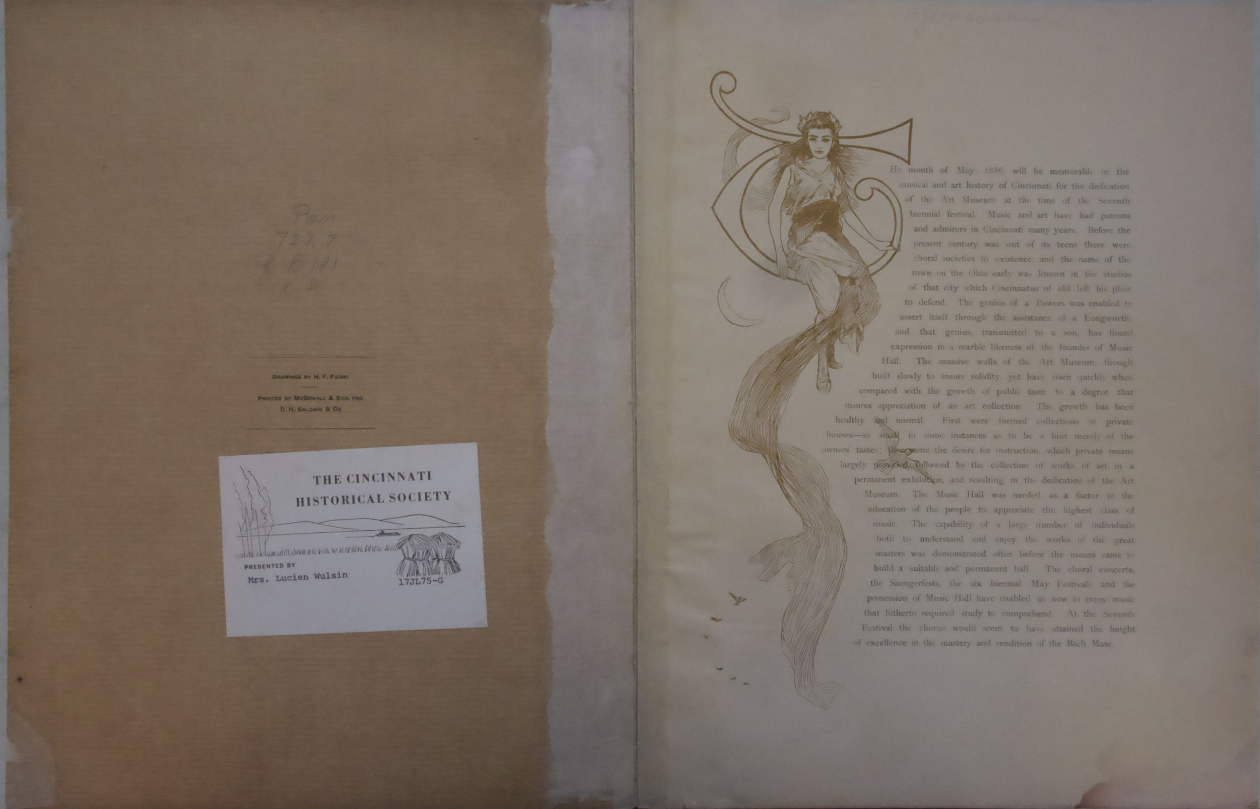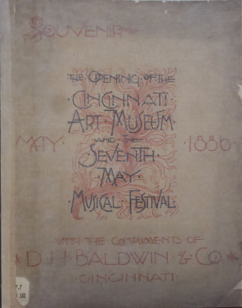 The Baldwin Company and Henry Farny joined forces in 1886 to create a souvenir the celebrated the Opening of the Cincinnati Art Museum and the Seventh May Festival. The brochure is twelve pages, though blank on a couple. The letter on the cover has a very Farny-familiar style, with the exaggerated san-serif lettering and the dots separating the words.