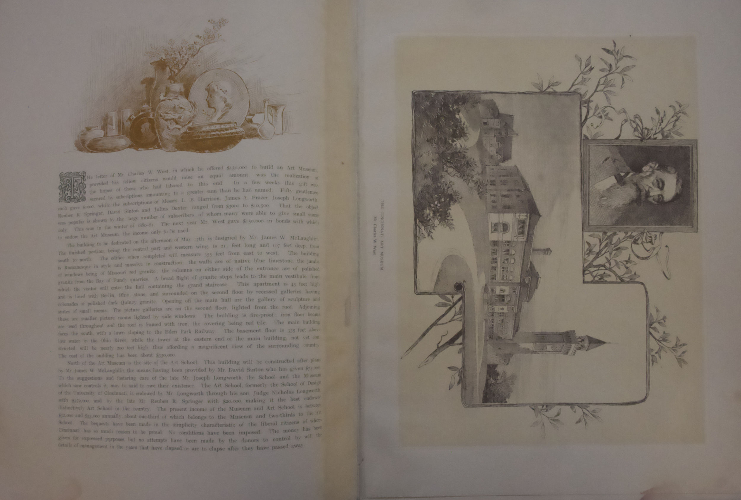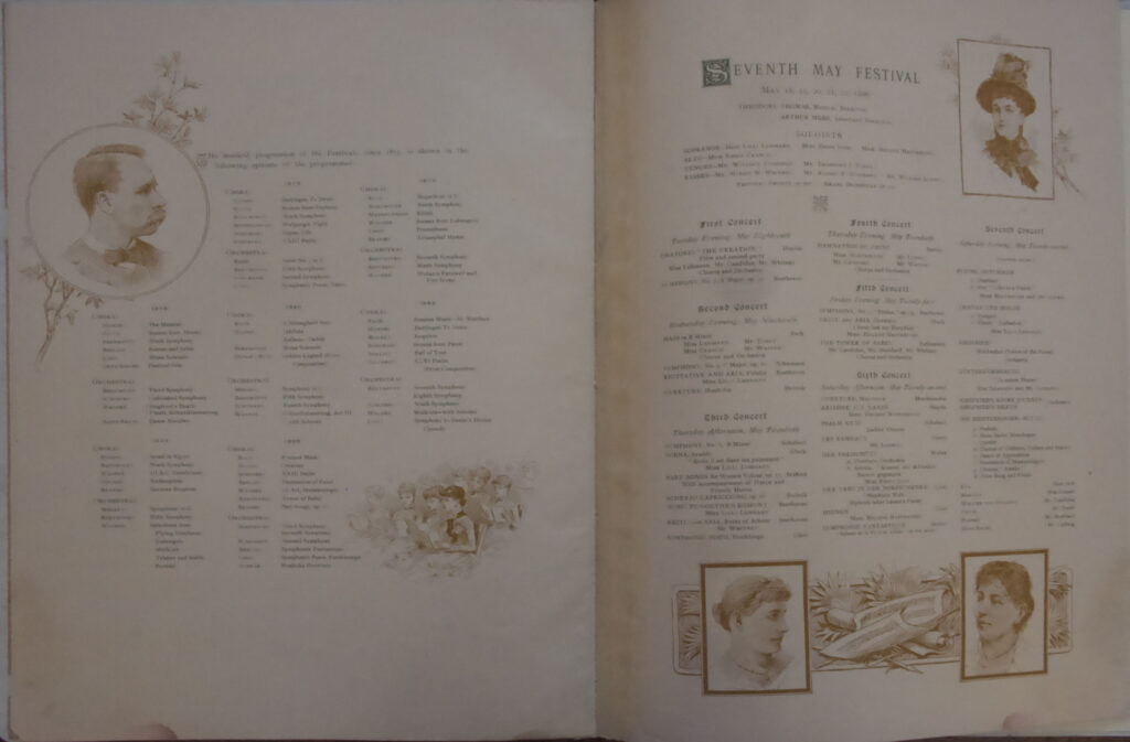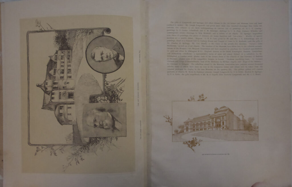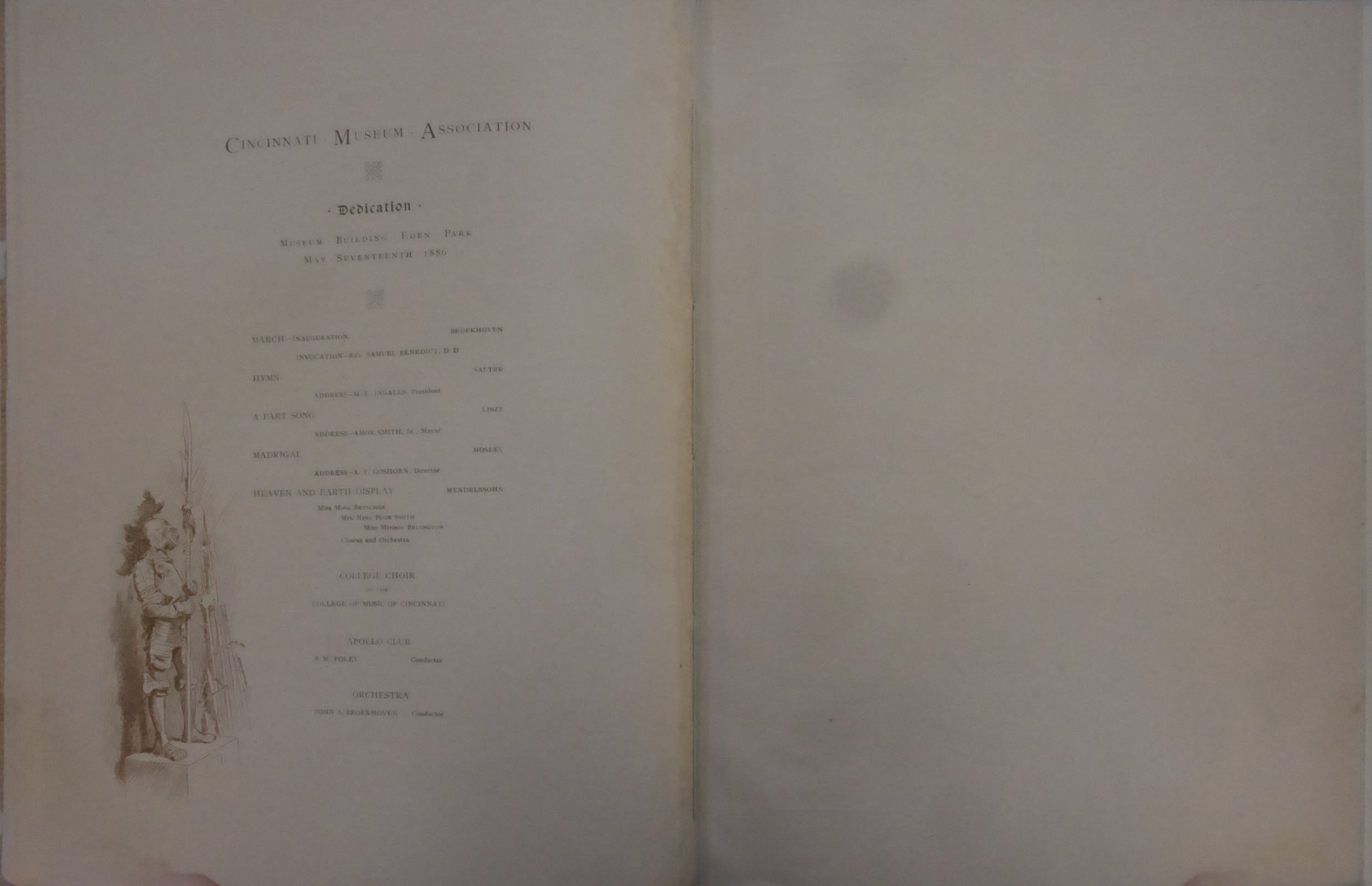 The Baldwin Company and Henry Farny joined forces in 1886 to create a souvenir the celebrated the Opening of the Cincinnati Art Museum and the Seventh May Festival. The brochure is twelve pages, though blank on a couple. The letter on the cover has a very Farny-familiar style, with the exaggerated san-serif lettering and the dots separating the words.