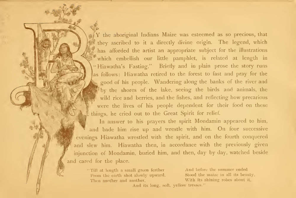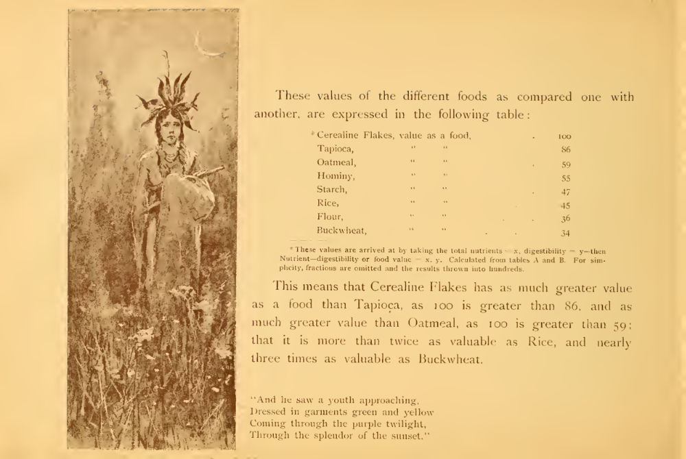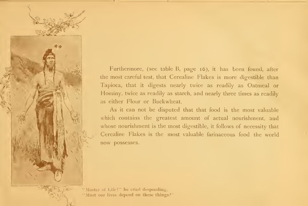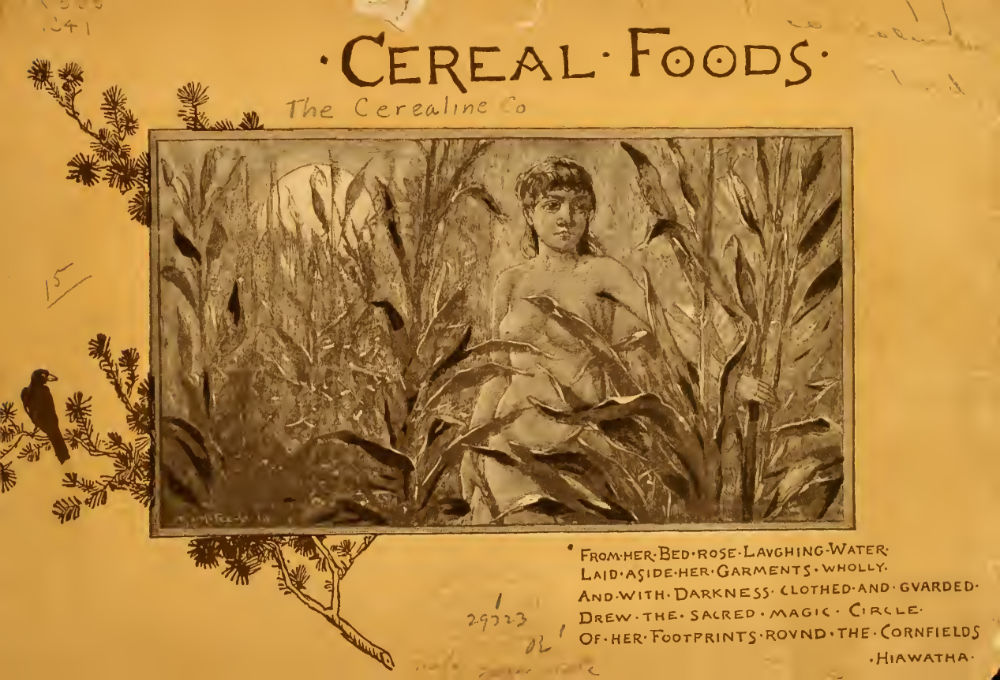 Cerealine were uncooked mashed grits that, before baked and used as cereal, were used in the brewing industry. At some point in the 1880s they were toasted (and malted?) and were sold as a breakfast cereal. To boosts sales, Henry Farny was enlisted to create a seventeen page brochure combining the benefits of consuming Cerealine with the pastoral ideals of farming, Indians, and nature.