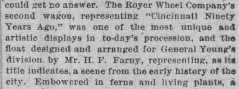 In 1883, Farny and Dewitt C. Waugh collaborated on a theatre screen for the Bijou theatre in New York City. The screen was a big hit. The Cincinnati Enquirer quoted…