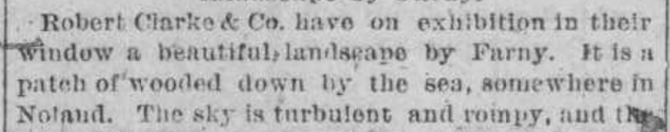 On November 15, 1879, page 7, The Cincinnati Commercial reported that Farny had a landscape titled “Hoyden Weather” on display in the window of Robert Clarke & Co. The reported…