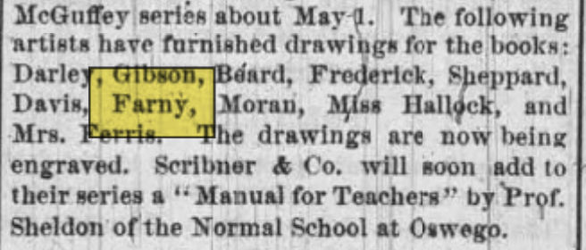 In late February, 1875, Farny traveled east to NY and Philadelphia. While traveling, The Buffalo Commercial reported that Farny, Thomas Moran, and others had furnished drawings for the new McGuffey…