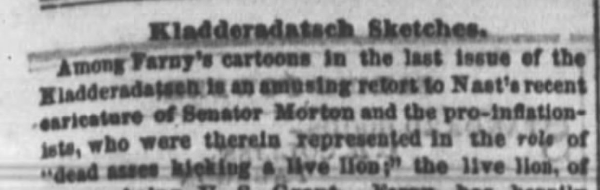 In May of 1874 Farny created several satirical cartoons for the Kladdersdatch newspaper in Cincinnati. I have been unable to locate images for these drawings. A note from an article…
