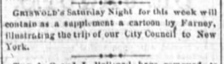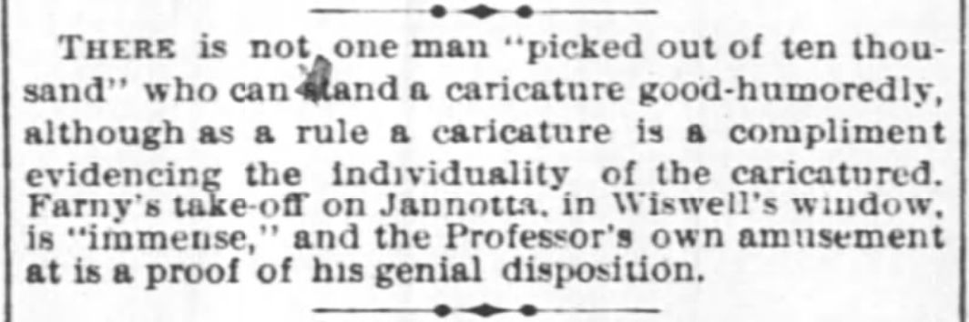 A July 20, 1877, article on page 8, column 4, in The Cincinnati Enquirer noted that a caricature by Farny of “Jannotta” had been placed in Wiswell’s window for customers…
