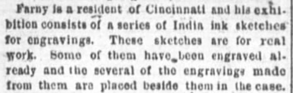 For the 1872 Cincinnati Industrial Exposition, Farny entered three artworks. In the Oil Painting class Farny exhibited “Solitude” (entry #67) and in the Watercolors/Drawing Class farny shared two pen drawings:…