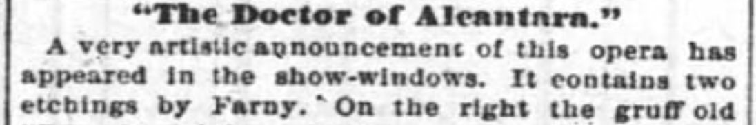 The Cincinnati Enquirer reported on April 03, 1880, that Farny had sketched some pictures currently on display that promoted the comedic musical “The Doctor of Alcantra“. The article included descriptions…