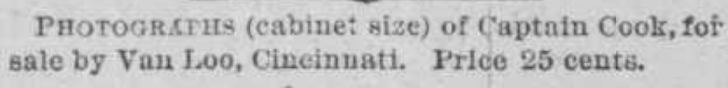 Two 1881 ads appear in the Cincinnati Commercial nearly atop one another offering Capt. Cook Cabinet photos for sale. The lower of the two notes added that the allegorical designs…