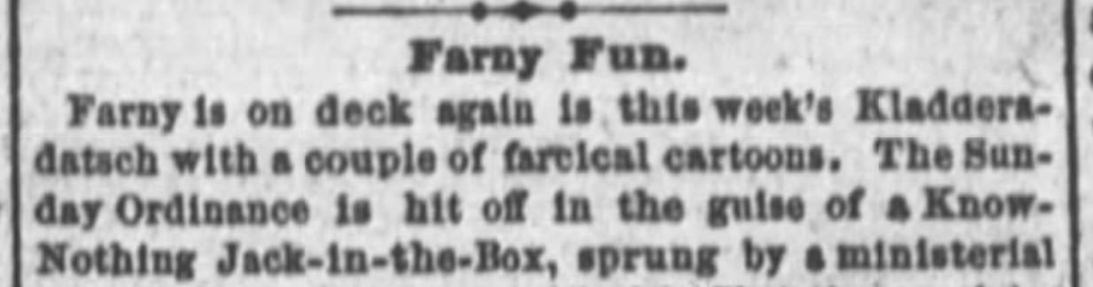 In May of 1874 Farny created several satirical cartoons for the Kladdersdatch newspaper in Cincinnati. I have been unable to locate images for these drawings. A note from an article…